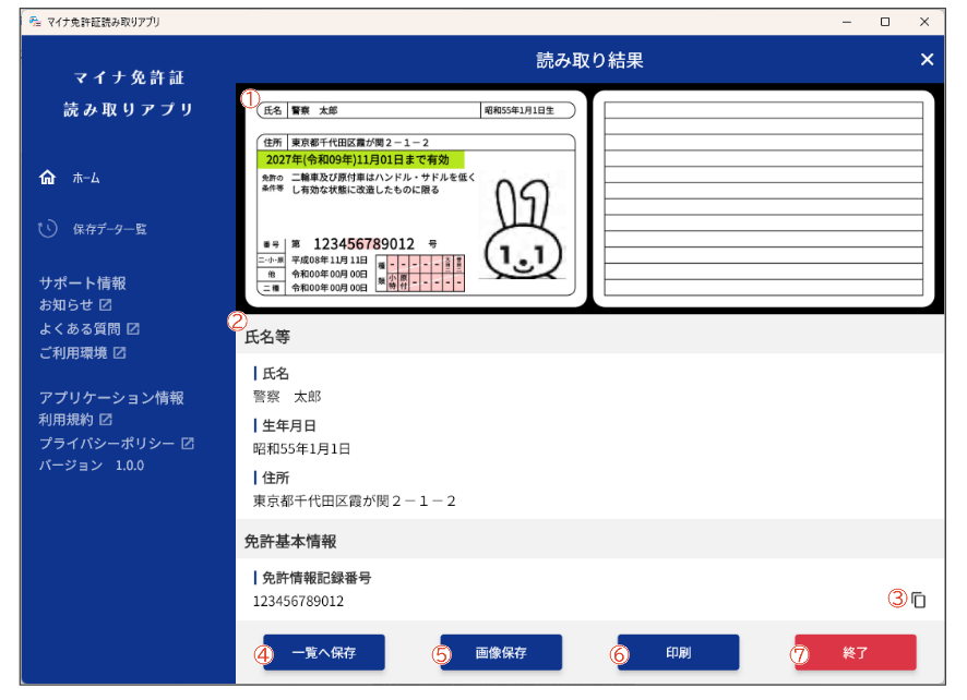 端末画面に表示された免許証情報を確認し、手続きが完了します。